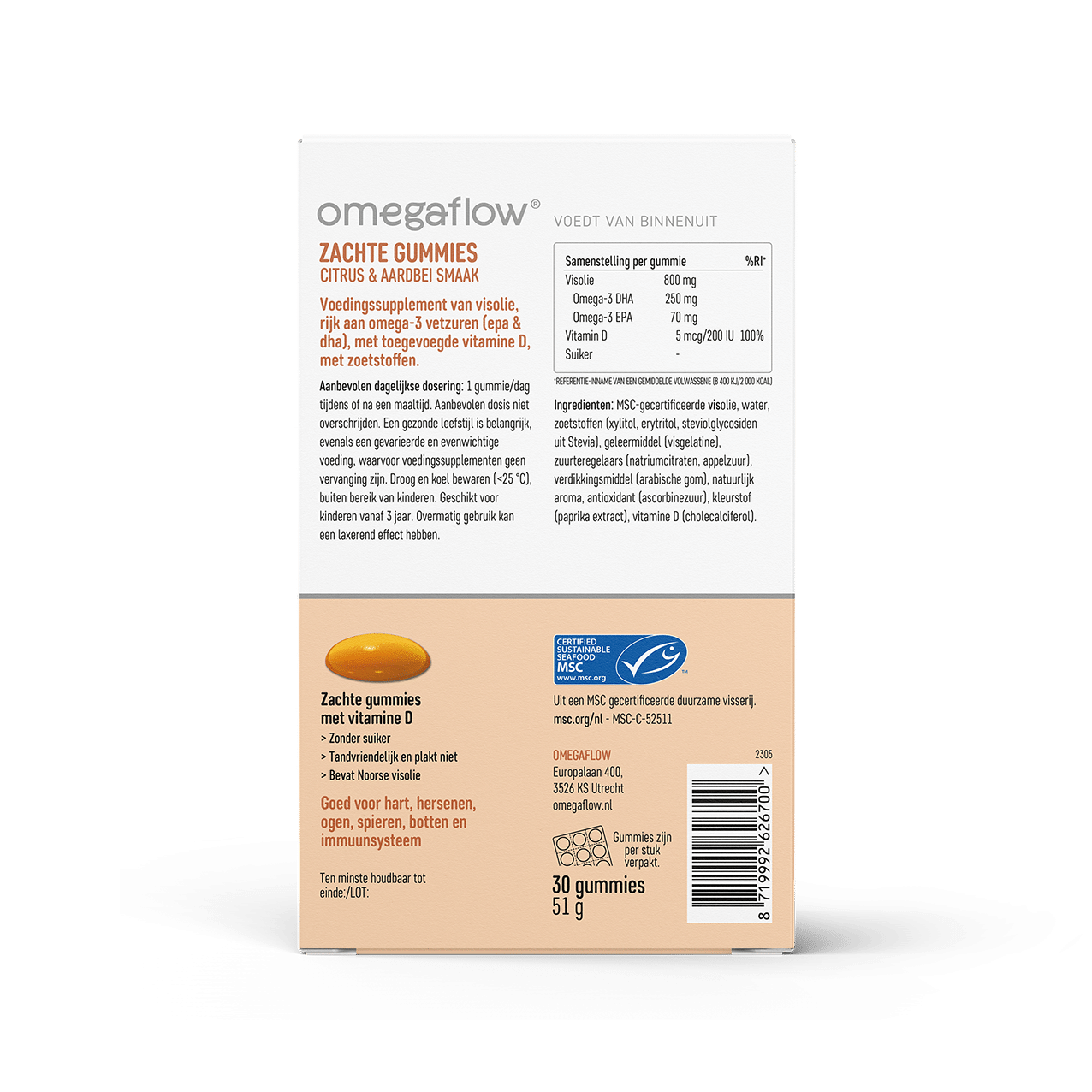 De meeste gummies zijn zeer laag gedoseerd. Omegaflow gummies bevatten evenveel visolie als een kleine capsule. Daarnaast zitten ze in een portieverpakking en zijn makkelijk mee te nemen. Daarnaast zijn ze vooral superlekker!